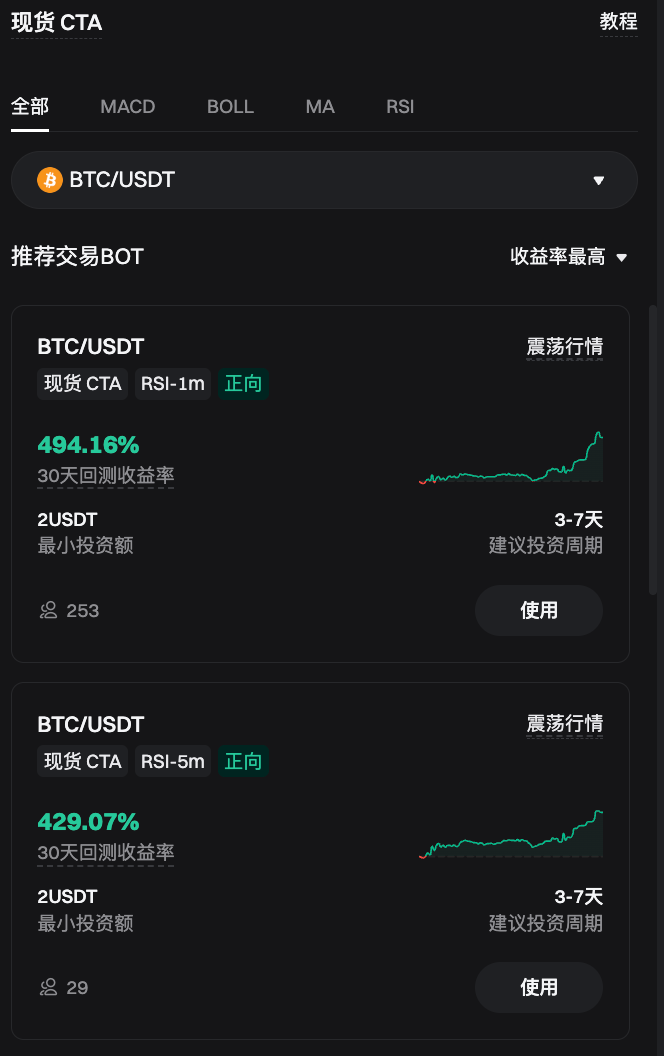 使用现货 CTA BOT 时,您可以根据市场情况和交易偏好选择以下策略之一: