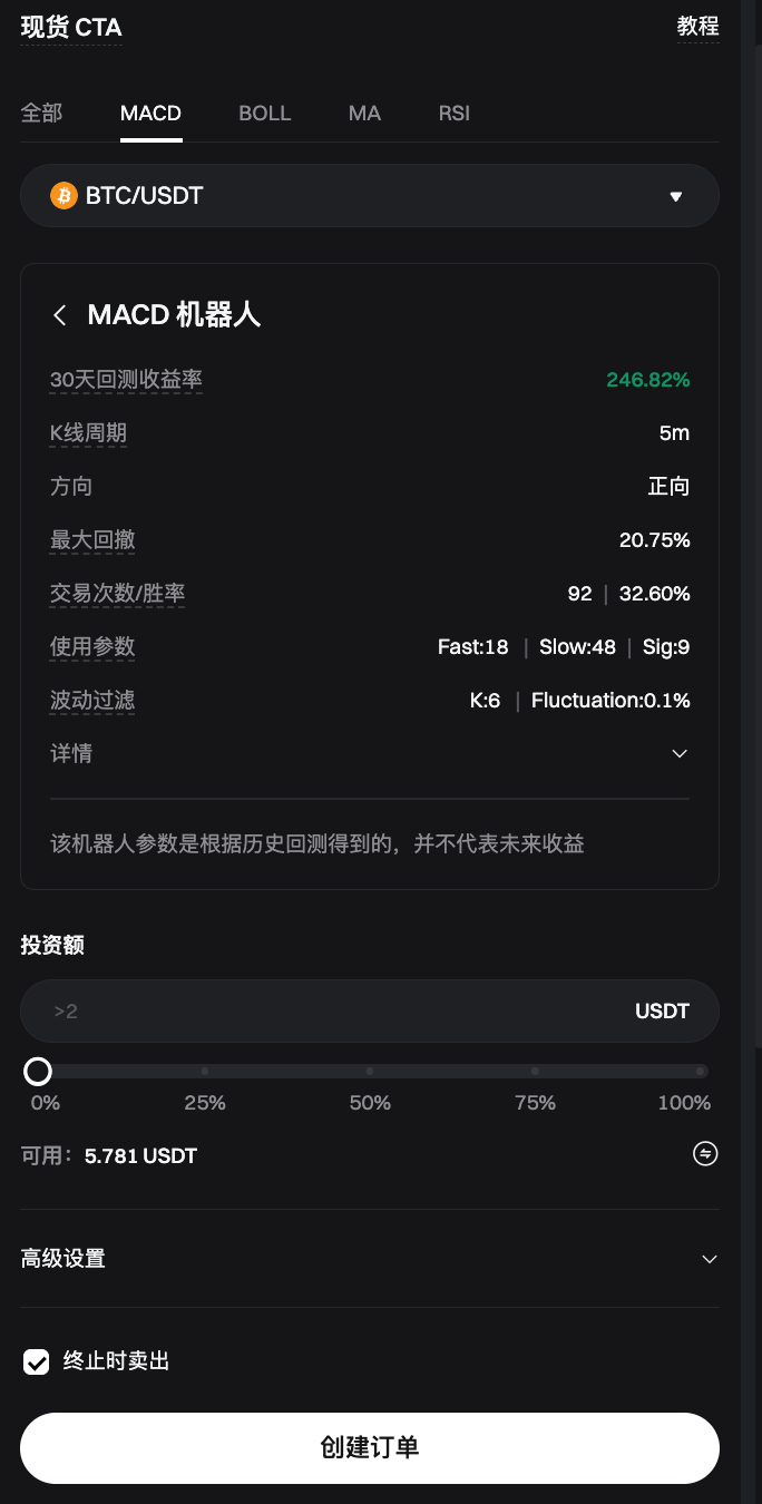 现货 CTA BOT 是一款自动交易工具,使用技术指标根据市场趋势执行现货交易。通过利用 MACD、BOLL、MA 和 RSI 等信号,BOT 简化了针对不同行情(包括趋势行情和震荡行情)的交易策略。它允许交易者自动执行买入和卖出操作,通过止盈和止损设置管理风险,并以最少的人工干预优化交易性能。