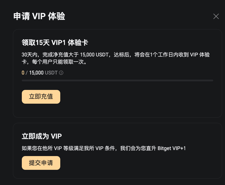 Bitget VIP 体验卡是一种活动卡券,让未满足常规 VIP 资格要求的用户也可体验 VIP 权益。您可使用此体验卡在限定时间内享受升级后的交易优惠。